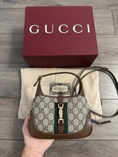 The Gucci Jackie shoulder bag in beige and brown canvas and leather is a stylish and versatile accessory for women. Made in Italy, this bag features a classic Jackie style with a slightly rubbed exterior and metal fittings. The bag's dimensions are 21cm x 31cm x 3cm, making it the perfect size for carrying essentials while adding a touch of luxury to any outfit. Perfect for everyday use or special occasions, this Gucci bag is a timeless piece that exudes sophistication and elegance. Leather worn a bit on bag