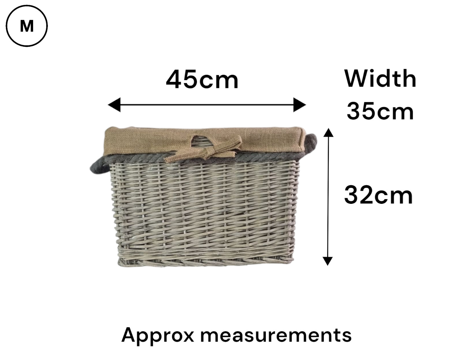 Rectangular Wicker Log Baskets with Hessian Liner. Perfect for linen, laundry, toys and bedding. Handmade with Rope handles. Small - 38.5cm x 28cm x 28.5cm approx. Available in 4 Sizes: (L x W x H).