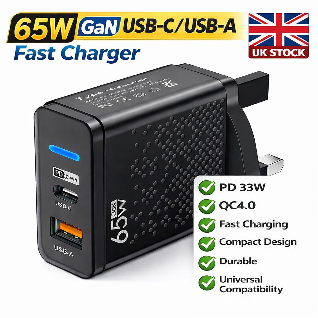 65W GaN Dual USB Type C Fast Charger UK Plug Power Adapter