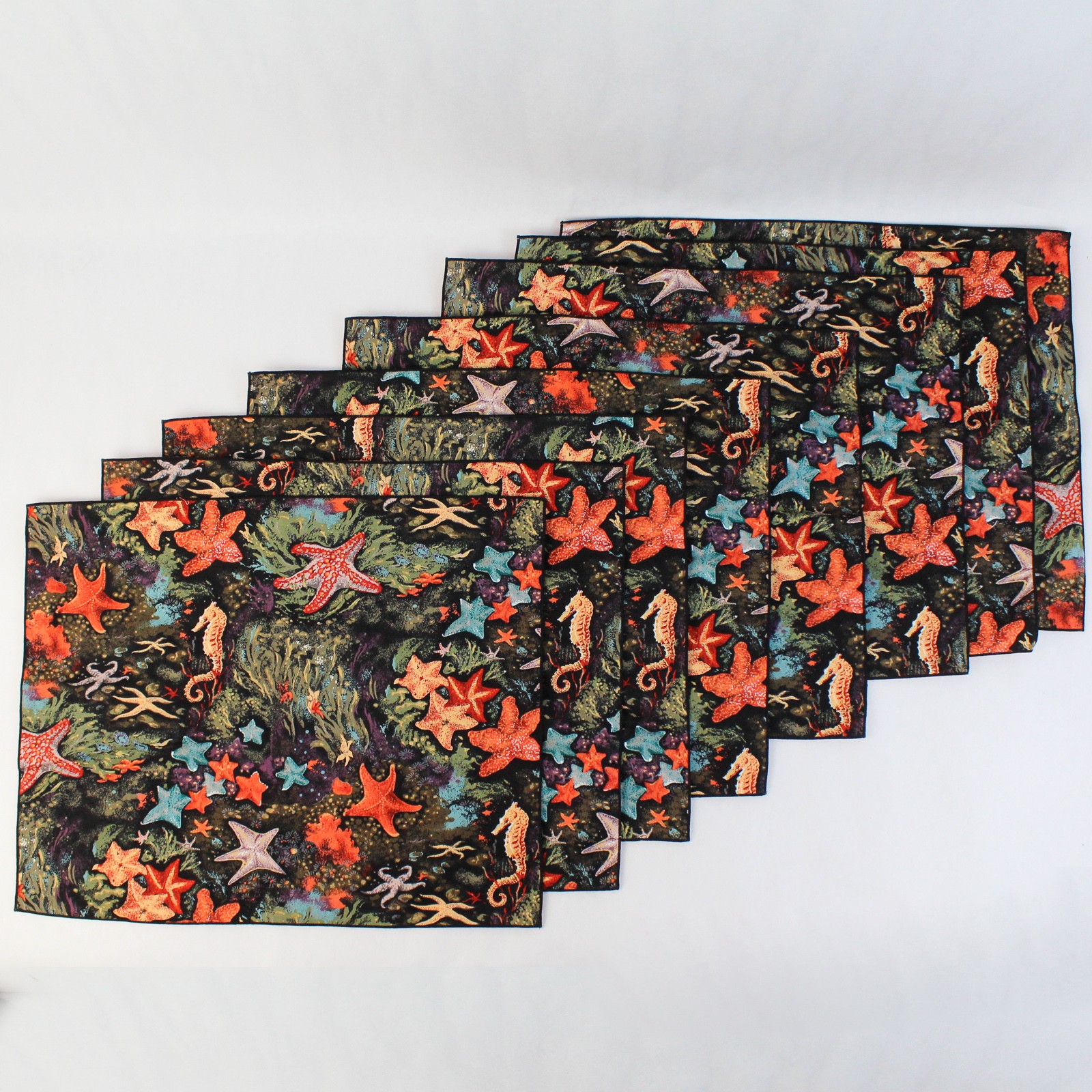 Enhance your dining experience with this set of 8 unbranded cloth napkins. Featuring a stylish starfish design on a black background, these napkins add a touch of elegance to any table setting. In good pre-owned condition, they measure 16" x 12.75". Perfect for casual or formal occasions, these napkins are both functional and decorative.