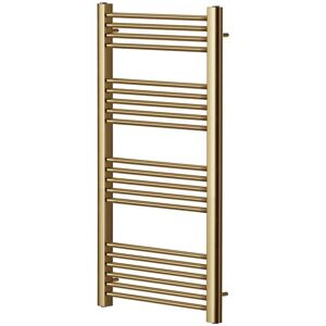 GENERAL DESCRIPTION The York Flat Brushed Brass Central Heating Towel Rail combines beauty and practicality, enhancing your bathroom with its high-quality brass finish. The design features wall brackets positioned on the uprights, allowing for more space to hang towels. This towel rail not only modernizes bathrooms but also provides additional functionality with its high heat output. TECHNICAL SPECIFICATIONS Adjustable wall brackets: 75mm to 90mm distance from wall to front of rail CE and EN442 certified Maximum working pressure: 8 bar ½” BSP water connections 22mm diameter cross tubes COMPATIBILITY AND ACCESSORIES All necessary components for installation are included, such as adjustable wall brackets, wall fixing screws, wall plugs, a blanking plug, and an air vent.