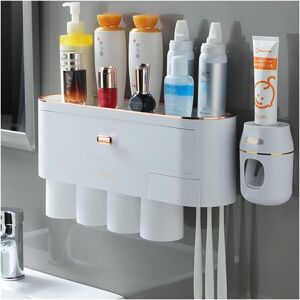 Ideal bathroom decoration: This toothbrush holder is very suitable for bathrooms, toilets, apartments, dormitories, camping, travel, hotels, etc. Toothbrushes can be stored and separated neatly to keep toiletries in order and minimize clutter. for families; It is also a perfect bathroom decoration. All in one: The wall-mounted toothbrush holder has a built-in automatic toothpaste dispenser that can squeeze a certain amount of toothpaste to prevent toothpaste from wasting Magnetic toothbrush holder in the bathroom: inverted cup design, which plays a role of dust and quick drainage. Effectively keep toothbrushes and cups dry and clean Say goodbye to messy: Not only a toothbrush holder and toothpaste dispenser, the storage tray on the top of the toothbrush holder toothbrush is multi-compartment, you can put toothpaste, cosmetics, razors, etc., but also built-in drawers. Save your counter space Easy to install: The toothbrush holder comes with a strong seamless sticker. Toothbrush holder