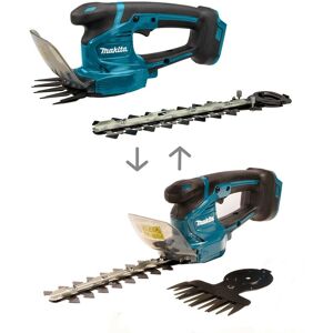 The Makita DUM111 is a cordless and agile 2 In 1 LXT 18V cordless hedge trimmer and grass shear. Its ergonomic design and lock-on function make for comfortable use, whilst the 3-stage cutting height allows you to refine your lawn.This clever machine also has an interchangeable blade function which means you can select the grass shearing blade or the hedge trimmer blade.The DUM111 is the little brother to the DUM604. Features The DUM111 is a two-in-one 110mm cordless grass shear powered by 18V Li-Ion battery Ergonomically designed handle 2 in 1: Both trimmer blade and shear blade can be attached Cutting height is adjusted at 3 stages - option extra Double blade action Tool-less blade change. Compact & Lightweight Lock-off button operable from both left and right sides Equipped with Battery protection circuit: designed to protect the battery from damages due to overdischarge, high temperature or overload current. Includes Hedge Trimmer attachment Blade cover Includes long handled lance