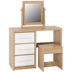 Features: Composite board Paper veneer Plastic veneer Mirrored glass Mdf back panel Mdf drawer base Metal handles Metal drawer runners Plastic feet Dimension & Weight Dressing Table Dimension: L39.5 x W100 x H76.5 cm Stool Dimension: L30 x W40 x H44.5 cm Mirror Dimension: L10.5 x W54 x H55.5 cm Total Weight: 33kg . Seville 3 Drawer Dressing Table Set. Delivery is free to UK Mainland, excluding AB31 to AB38, AB40 to AB56, IV, KA27 & KA28, KW, PA20 to PA78, PH4 to PH50 and ZE in Scotland; BT for Northern Ireland; all postcodes within the Republic of Ireland where a surcharge will apply, please check before ordering.. 3#5