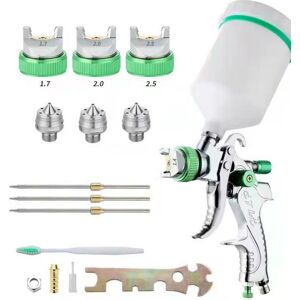 Professional gravity feed HVLP spray gun with 3 fluid tips of 1.7mm, 2.0mm, 2.5mm. Allowing you to paint for a wide range of coatings and all kinds of surface paints. This spray gun makes spraying smoother, easier to control and less overspray. Ideal for spraying basecoats, clear coats and other high viscosity coatings, also suitable for domestic and industrial primers, topcoats and detailing for the automotive industry, furniture and equipment painting. Stainless steel needle and nozzle for longer life and use with water-based paints. High volume low pressure technology applies paint with less force, prevents paint splatter.