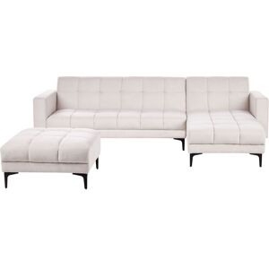Tufted Corner Sofa with Reclining Backrest. Treat yourself to the perfect addition to your living room with this elegant corner sofa in a set with a matching ottoman. Upholstered in high-quality fabric, it offers a comfortable sitting spot for up to four people. The reclining backrest enhances comfort, while the click-clack mechanism transforms it into an occasional sleeping spot. Featuring tufted detailing and a lovely beige finish, the sofa brings a cosy yet stylish charm to your space. Explore other pieces in the collection to create your ultimate relaxation haven. Details: Product Type: Sofa Bed Style: Minimalist General Color: White, Black Shade: Off-White Material Type: Fabric Main Material: Fabric Additional Material: Iron Filling Material: Foam Material Composition: 100% Polyester Shape: L-Shaped Arm Style: Track Leg Caps/ Pads: No Orientation: Left Hand Reclining: No Seat Construction: Elastic Belt Seat Foam Density: 25 kg/m3 Seats Up To: 4 People Sleeper Function: Yes Sofa