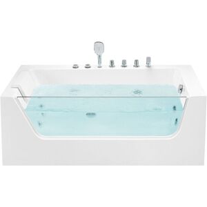 White Corner Tub. This luxurious corner tub is the perfect remedy for a long day, fitting two people comfortably. Elegant chrome fittings, a waterfall tap, and two black headrests provide all you need to relax in style. Soothe yourself with ten hydro massage jets and underwater LED lighting in seven colour options. The tempered glass panel adds a fun and unique touch. Made of acrylic, it is easy to wipe clean. Details: Product Type: Corner Bathtub Style: Modern General Color: White, Black, Silver Material Type: Acrylic Main Material: Acrylic Additional Material: Metal Shape: Triangular Digital Control Panel: No Finish: Gloss Hydro Massage Jets: Yes Jetstreams: 12 Power consumption: 750 W Noise Level: 50-85 Seats Up To: 2 People Voltage rating: 230 V (50 Hz) Jet pump: 0.75 kW/h Underwater Light: Yes Capacity: 370 Waterfall: Yes Dimensions: Width: 146 cm Inner Dimensions: 110x75x45 Length: 205 cm Height: 61 cm Weight: 74 kg Weight Capacity: 370 kg Offer Includes: 1 x Drainage Pipe, 1 x