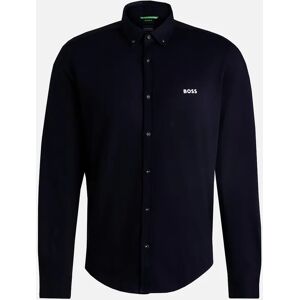 Hugo Boss men's Motion navy long sleeved shirt. Crafted in a anti wrinkle soft cotton in a stretch fabric. This shirt is tailored to a regular fit with BOSS logo to chest, button down collar and long sleeves with button cuffs. Made from 100% cotton for a comfortable fit.