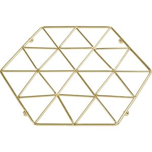 Forming the shape of a hexagon, the strong iron wire frame features a warm gold plated finish that coordinates well with the Vertex utensil holder. Its series of triangular shapes combine to form a pleasing geometric pattern. Four small feet keep it slightly raised from kitchen surfaces, allowing air to circulate under the pot or pan.