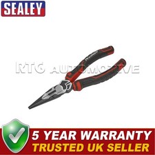 General description Sealey Premier High Leverage Long Nose Pliers are designed for both professional and DIY use. These pliers are manufactured from hardened and tempered drop-forged Chrome Vanadium steel, ensuring durability and strength for various tasks. Technical specifications Model No.: AK8373 Material: Hardened and tempered drop-forged Chrome Vanadium steel Induction-hardened cutting edges: 55-65 HRC Length: 200mm Type: Long Nose EAN: 5054511234596 Usage The pliers feature finely ground polished heads, serrated jaws, and precision ground cutting edges, making them suitable for cutting both hard and soft wires. The dual material comfort grip handles provide added comfort during use. Other information