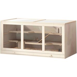 Upgrade your hamster's home with PawHut's Syrian hamster cage! It features a cosy hut for relaxing and a wide ramp, offering plenty of room for exercise. The acrylic windows let you easily watch your pets enjoying their spacious habitat. Built with fir wood and wire mesh, it's a strong and dependable haven for small pets like dwarf hamsters, gerbils and more. Specifications: ● Colour: Natural Wood Finish ● Material: Fir wood, metal and acrylic ● Overall dimensions: 38H x 100L x 58Wcm ● Main house: 34H x 98L x 54Wcm ● Top door: 100L x 58Wcm ● Hut: 20H x 28L x 20.5Wcm ● Ramp: 33L x 8.5Wcm ● Tray: 3H x 100L x 54Wcml ● Wire diameter pitch: 1.2L x 1.2Wcm ● Item label: D51-359V00ND ● Note: If your pet has teething habits, you may want to buy some teething sticks or something similar Features: ● Includes a hut and ramp for relaxing and roaming ● Openable top for easy access ● Sliding tray makes cleaning simple ● Front acrylic panel provides a clear view inside the cage ● Wooden structure