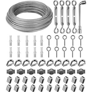 【Perfect Combination】Includes 35M Φ3mm stainless steel wire rope, 4 turnbuckle cable tensioners, 10 * wire rope thimbles, 20 aluminum crimping buckles, 10 eye screw hooks, 8 wire rope clips, 10 plastic expansion tubes, 1 open-end wrench. 【High Quality Material】Made of stainless steel, the insulated cable with smooth surface and covered with nylon prevents the wire rope from rusting, it has good corrosion resistance; The crimping buckle is made of aluminum, hard and sturdy, and can be used for a long time in all weather. 【Easy to assemble】Each part is threaded, very convenient to install and disassemble, the screw can be used multiple times, the wire rope has a pulley suitable for the opening of the wire rope, it is not easy to knot, you can freely cut the required length with wire cutters, crimping tools are recommended, which are more convenient. 【Wide range of applications】Steel wire rope Suitable for outdoor applications of tent rope, clothesline, climbing plant trellis, garden