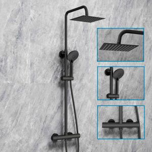 Description This thermostatic shower faucet with stem valve allows you to stop or control the flow of shower water, while the thermostatic control provides complete temperature performance, perfect for any modern bathroom. The left handle of the bar shower controls the water on/off and switching modes between the two outlets; the shower head and shower handle and the right handle control the temperature from 20-50 degrees Celsius and has a safety stop preset to 38 Celsius set temperature to ensure comfort and safety. The height of the lifting rod can be adjusted, and the product also comes with an adjustable stand for the hand shower that you can slide up and down on the rails as needed. Comes with slim shower head, handset, 1.5m hose and stand. Square Exposed Twin Head Shower - Matte Black 8" (200mm) stainless steel square slimline shower head with adjustable swivel so it can be tilted to adjust the spray and provide ease of use Modern matte black finish Anti-rust and