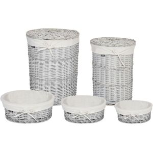 Willow Wood Baskets Set. Bring a touch of natural elegance to your home with this handcrafted set of 5 white willow baskets. Featuring two spacious, round laundry baskets with lids and three smaller storage baskets, this collection is designed for both beauty and functionality. The baskets are lined with removable, washable fabric, making them easy to maintain while keeping your items neatly stored. Perfect for any room, these durable and stylish baskets provide a versatile storage solution with a charming, rustic appeal. Details: Product Type: Laundry Baskets Style: Boho General Color: Grey, White Material Type: Wood Main Material: Willow Wood Additional Material: Fabric Material Composition: 73% Polyester Shape: Round Finish: Painted Handmade: Yes Capacity: 55/89 Dimensions: Depth: 45/38/28/23/18 cm Width: 45/38/38/33/28 cm Height: 56/49/15/13/11 cm Overall Dimensions: 45x45x56 Weight: 3.5 kg Offer Includes: 5 x Basket Key Features: Adds a Homely Touch to Any Room, Decorative Yet