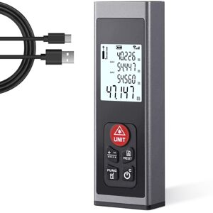 HIGH ACCURACY - Using laser precision technology, accuracy up to ±0.3-50M with a measuring accuracy of ±1.5mm, the measuring distance extends to 50m; Switchable between M/In/Ft for free adjustment. With 2 unique bubble levels that allow more accurate measurement compared to a bubble. LCD BACKLIGHT & MUTE SETTING - The large backlit display gives you better visibility in dark areas. With the mute function, you can turn the beep on or off as you like. Suitable for use in libraries, classrooms and other quiet places. MULTIPLE MEASURING FUNCTIONS - area, distance, length, volume, continuous measurement, Pythagorean method - three points; Addition and subtraction; Low battery indicator; 99 groups of data storage; Delete data manually; Auto power off after 150 seconds without operation to save electricity. DURABLE AND PRACTICAL - IP54 waterproof and dustproof function provides maximum protection for the laser distance measurer. Portable size and hard rubber body ensure a good grip; With the