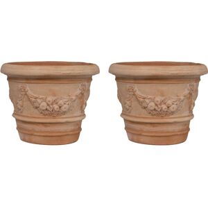 Set of 2 vases made of anti-freeze Tuscan marl clay, size diameter 40 cm, height 30 cm. The handmade production and firing follow the old Tuscan traditions. The quality of the clay and the firing system make the decorated vase highly resistant to frost and all weather conditions. All measurements refer to the maximum size of the article. Each outdoor planter is created from high-quality materials to ensure durability and weather resistance, making it perfect for outdoor environments such as gardens, porches and balconies, but it is also a perfect decorative indoor planter. The entirely handmade workmanship makes each item unique. These terracotta outdoor pots are suitable for any type of plant. Whether flowers, succulents or shrubs, the handmade pot provides an ideal environment for plants to grow, combining functionality and aesthetics. Whether furnishing a garden, a porch, a balcony, a living room, a kitchen or a dining room, these terracotta pots perfectly complement any style of