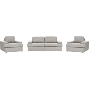 Upholstered Sofa Set in Classic Design. Furnish your living room with this sofa set consisting of a 3-seater sofa and 2 armchairs of a classic design that will perfectly complement living rooms in various styles. Upholstered in durable polyester, with a wooden stable frame construction, the piece is designed to last many years in good condition. The thickly padded seat and back make it a comfortable and stylish piece of furniture. Combine it with a wooden coffee table and transform your living room into a perfect spot to unwind and relax. Details: Product Type: Sofa Set Style: Traditional General Color: Brown Shade: Taupe Material Type: Fabric Main Material: Fabric Additional Material: Plywood Filling Material: Foam Material Composition: 100% Polyester Arm Style: Track Seat Construction: Pocket Springs Seat Foam Density: 20 kg/m3 Seats Up To: 5 People Sleeper Function: No Dimensions: 3 Seater Sofa Dimensions: 208x112x86 Armchair Dimensions: 108x103x85 Seat Thickness: 19 cm Seat