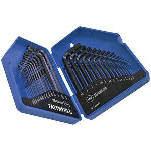The Faithfull Hexagon Keys are six sided wrenches for driving socket screws which are used mostly on machinery for fastening parts tightly together. Fully hardened chrome vanadium. Sizes: 15 x Metric: 0.7. 0.9, 1.3, 1.5, 2, 2.5, 3, 4, 4.5, 5, 5.5, 6, 7, 8, 10mm. 15 x Imperial: 0.028, 0.035, 0.050, 1/16, 5/64, 3/32, 7/64, 1/8, 9/64, 5/32, 3/16, 7/32, 1/4, 5/16, 3/8in.