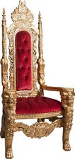General description Solid mahogany wood throne measuring W88xDP70xH180 cm, featuring a gold finish upholstered seat and back covered with elegant red velvet. This throne is completely hand-carved, showcasing two lion heads on the legs and two heraldic coats of arms with an eagle, faithfully reproducing the ancient thrones of Renaissance style. Technical specifications Dimensions: W88 x DP70 x H180 cm Material: Solid mahogany wood Upholstery: Gold finish with red velvet Other information All measurements refer to the maximum size of the article.