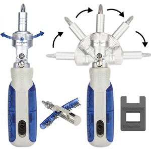 Ratchet screwdriver: The ratchet design responds to three different directions of use (right, fixed, left). Powerful multi-directional torque and high-strength chrome vanadium material are stable, saving a lot of time and effort.Rotating screwdriver: 180° rotating screwdriver for easy tightening and loosening of fasteners.The screwdriver can be rotated 180° and fixed at different angles by knobs to work in narrow spaces.Solve the problem of screw not locking in a small space.Screwdriver set: 1 ABS screwdriver handle + 14 S2 alloy steel drill bits. Including 3 cross bits: PH0/PH1/PH2, 3 flat bits: SL3.0/SL5.0/SL6.0, 1 tricorn: Y1, 1 wrench: U6, 2 star hexagon: T15/T20, 2 hexagon socket: H4 /H5, 1 triangle: 2.3, 1 rice font PZ2. Multifunctional screwdriver: Non-slip handle ensures a comfortable and secure grip. Screwdriver bits can be stored in the handle. Easy storage when traveling. Pack of 14 bits made of S2 alloy steel. Made of heat-treated chrome vanadium steel for high hardness.