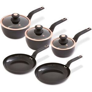 Create delicious, healthy fat-free meals with the Tower Cavaletto 5-Piece Cookware set of 16cm, 18cm, 20cm saucepans and 24cm, 28cm frying pans. With superior Cerasure ceramic coating each pan requires little to no oil for healthier cooking, with exceptional non-stick properties which leaves little residue behind. Each pan features Softtex handles in an elegant black and rose gold finish, for maximum comfort and style when cooking. Featuring a bonded steel base which is compatible with all hob types including gas cookers, electric hobs and induction set-ups. Each pan is crafted from pressed aluminium with expert heat transfer, for overall quicker and more efficient cooking. Its aluminium body is free from PFOA, PFAS, PTFE, Lead and Cadmium This trendy 5-piece cookware set is coated in black with rose gold accents, perfectly styled with other essentials in the Cavaletto collection. Tower Colour: Black/Golden
