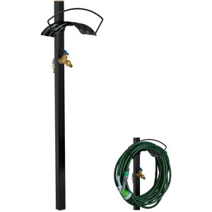 The free-standing tap with hose hanger is a practical piece of equipment for any garden. Wind up your garden hose to save space and conveniently unwind it again. This prevents it from kinking and means it is always ready for use quickly. By connecting one end of the tap to the water supply, you can water your beds directly from the hose stand. The tap with hose pipe holder is free-standing and can be placed anywhere you need it in the garden. Note: Hose is not included. Another hose is also needed to connect to your water supply. Standing Tap Details - Total size H x W x D: approx. 107.5 x 33 x 18 cm - Space for hose W x D: approx. 25 x 13 cm - For 5/8" hose approx. 45 m long - Connectors: 2 x 3/4" - Hose adapters: 2 x 1/2" Hose Holder - Max. weight capacity: approx. 10 kg - Weight: approx. 3.1 kg - Material: Steel, brass - Colour: Black Hose Holder with Tap - Practical hose hanger and standing tap in one - Hose is always at hand and won't kink - With connectors for attaching hose to